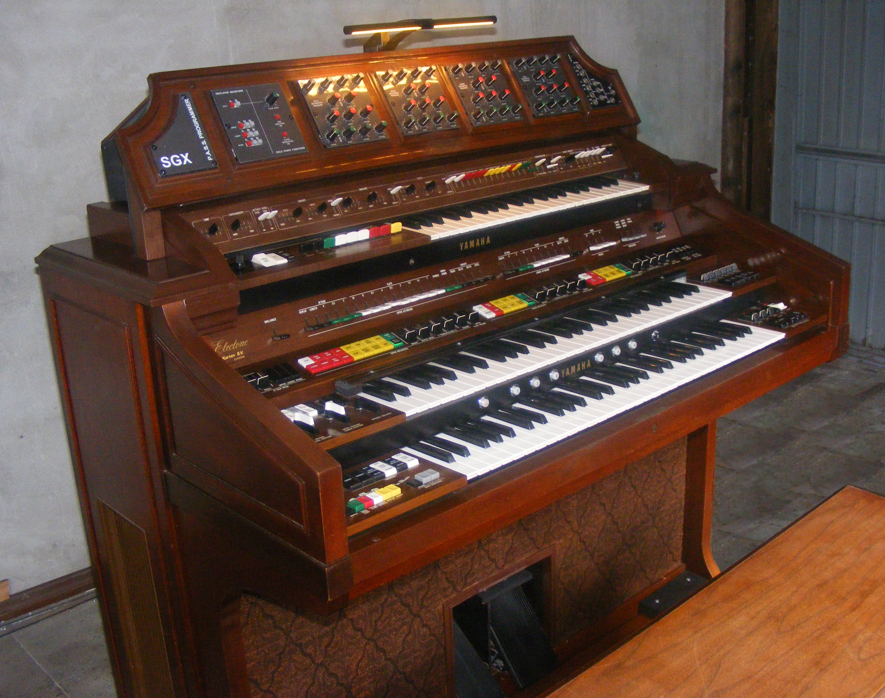 This is a heavily customized E-70 organ with the synth functions of all 3 orchestra sections (upper keyboard, lower keyboard, pedals) fully and independently programmable. Furthermore a 4th solo section has been added.