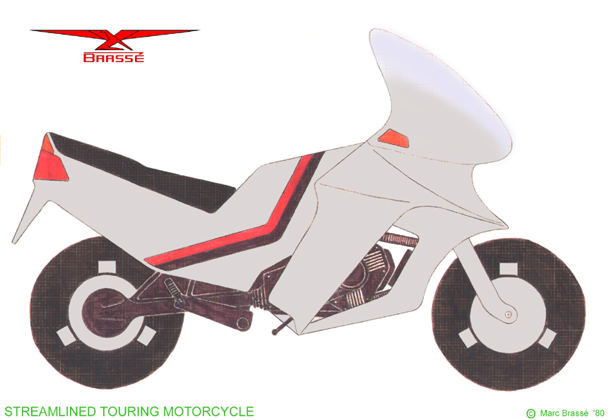 This design is my take on the ideal sports bike. It's not a pure racer nor a conventional sports tourer. It is intended more to be the near ultimate machine for swerving over bendy roads.
