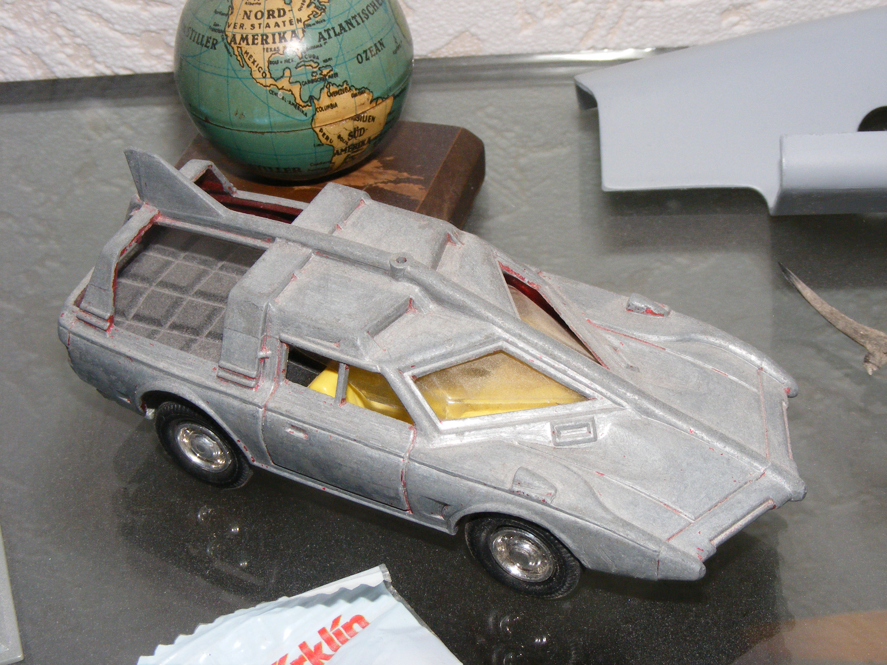 I actually had the most problems with choosing the colors. The series was shot in black and white but the real models where gray on top with yellow at the bottom. They used those colors for lighting reasons but believe me: in real life they look dreadful. So I compromised a bit by going for a black, gray and sliver dominated look with gold on the underside. The yellow edges are meant to impersonate the glowing aspect  of the original model, which was lighted from the inside. O.K. Well, at least the proportions are almost spot on and when photographed in black and white it might actually become difficult  to see the difference between this model and one of the smaller originals (with a little bit of luck, that is!).