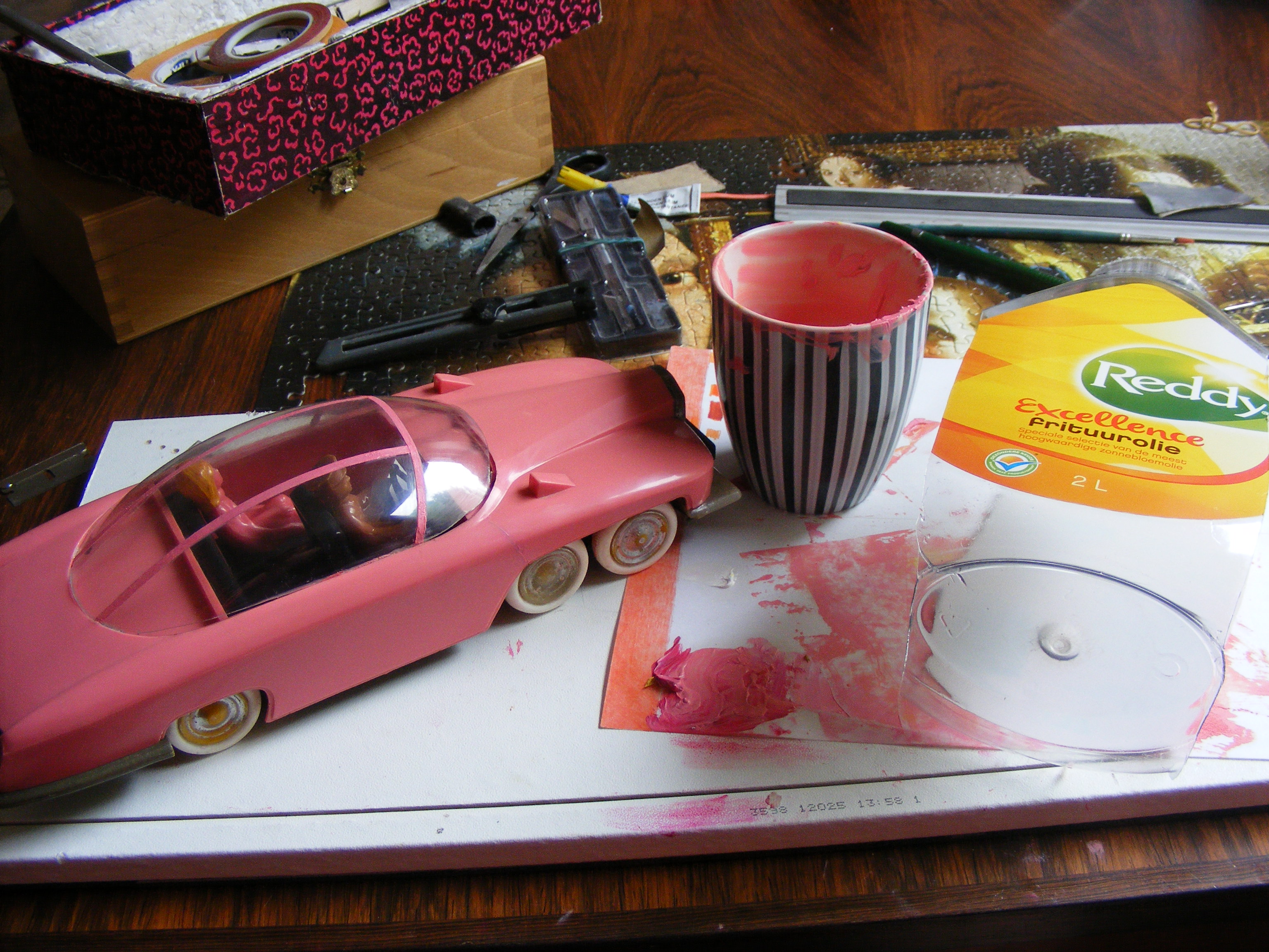 The stripes where made from white paper sticker sheet and the color mixed in oil paint (Now what else would I do with oil paint?!).