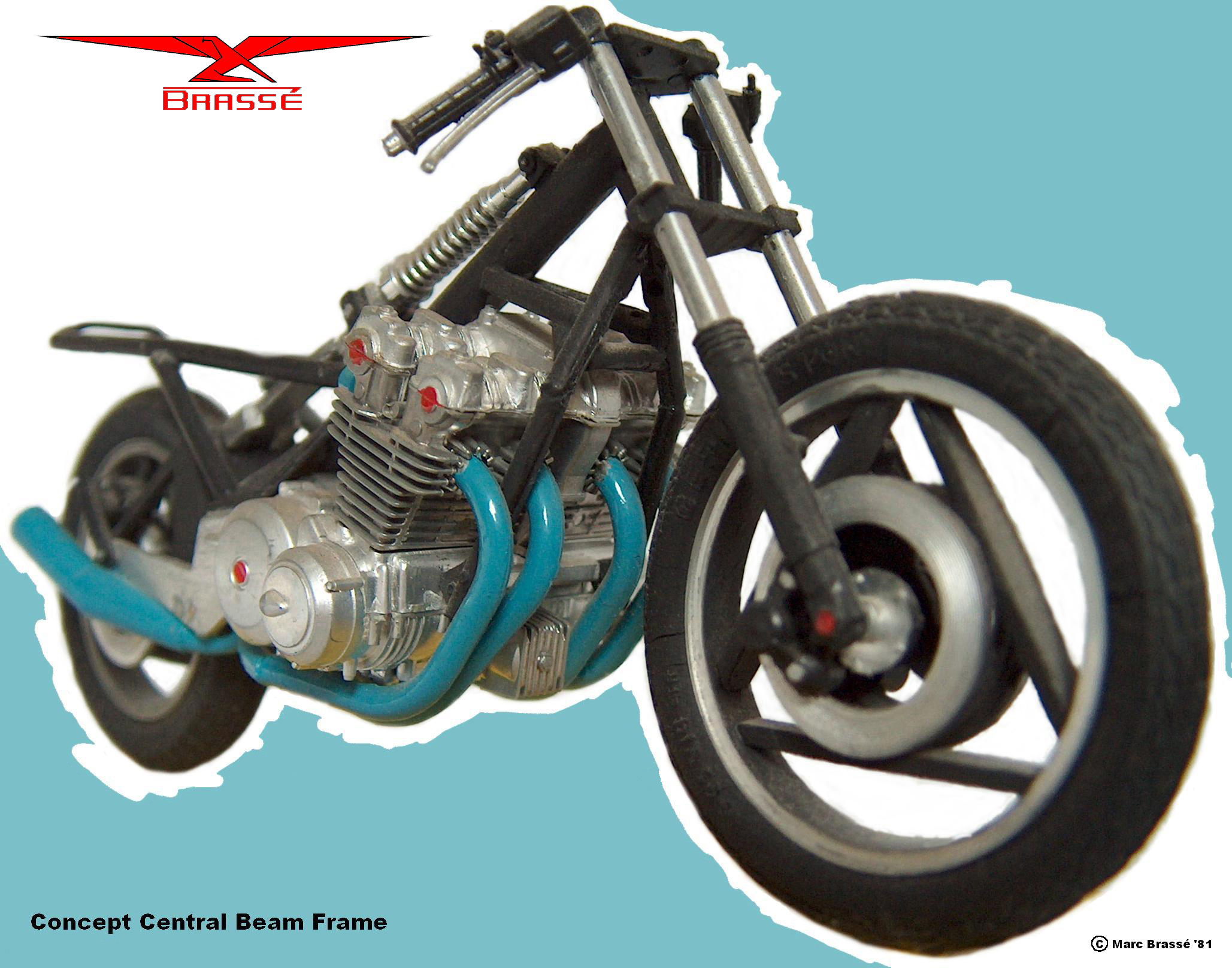 This is quite an early example. It is the model of a motorcycle frame I designed. In practice it is a sort of mix between Fritz W. Egli's famous central beam frame and a layout Moto Guzzi used on it's off road V-twins, although I actually was not aware of the latter at the time. Another interesting detail are the wheels. A few years later Massimo Tamburini designed very similar wheels for the Ducati Paso. He must have stolen that layout from me! Only joking of course but these are actually 2 examples of real world parallel development in one single design. Could it be that I have some talent for designing motorcycles myself?